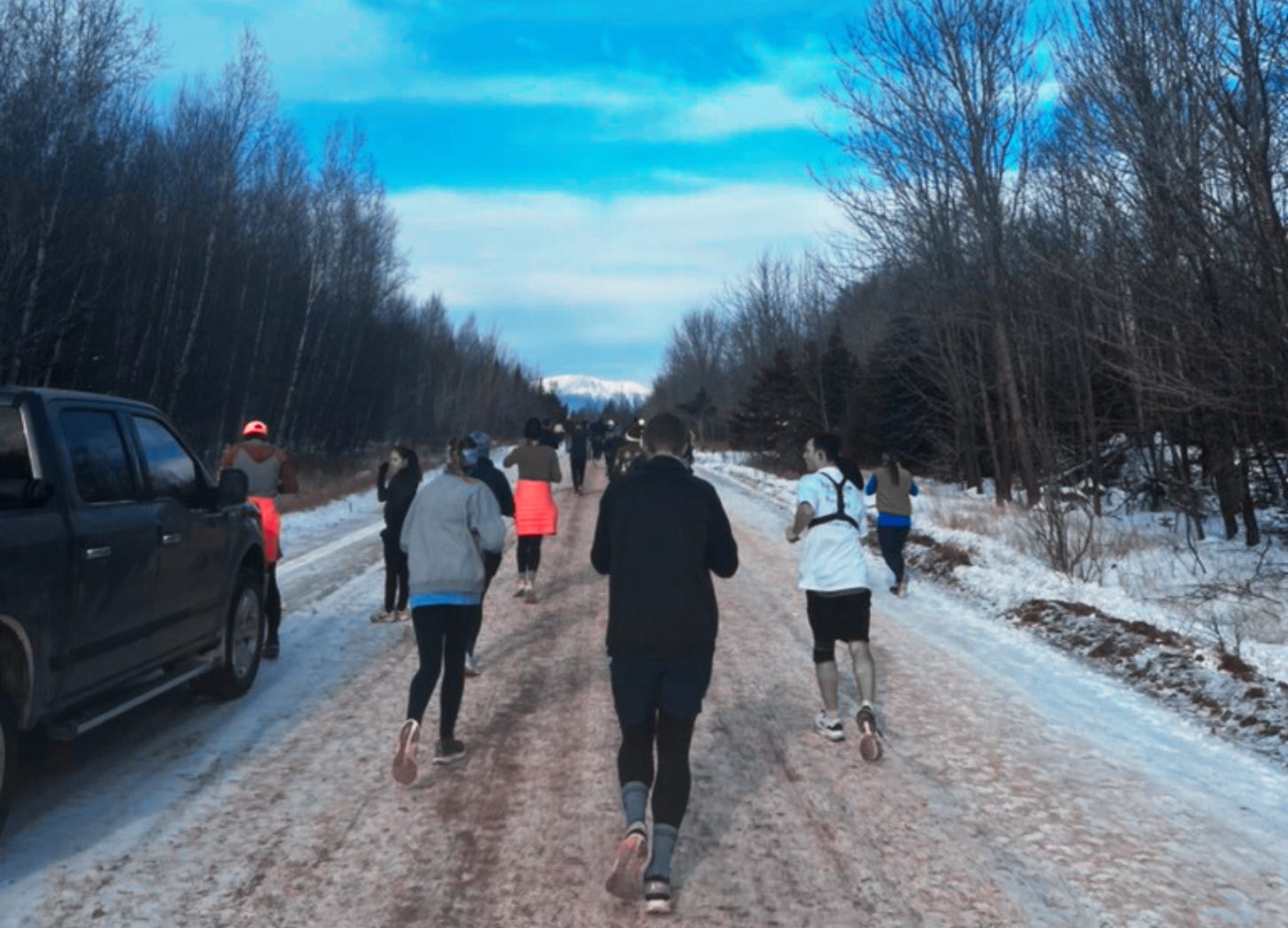 The race morning dawned cold and gray. The starting gun fired and I, along with roughly two thousand others bundled in beanies and layers of technical fabric, pounded the pavement on Penobscot Avenue. Slushy snow lined the Golden Road, Maine’s famous North Woods logging route. Clouds hid the classic Mile 5 view of Katahdin. There were hills, hills, and more hills. There was ice and slush. There were runners racing to qualify for Boston and runners moving at their own pace, dressed as Fireball nips and Santa Claus and even an older gentleman from a local ski mountain doing the race decked out in full snowmaker gear.