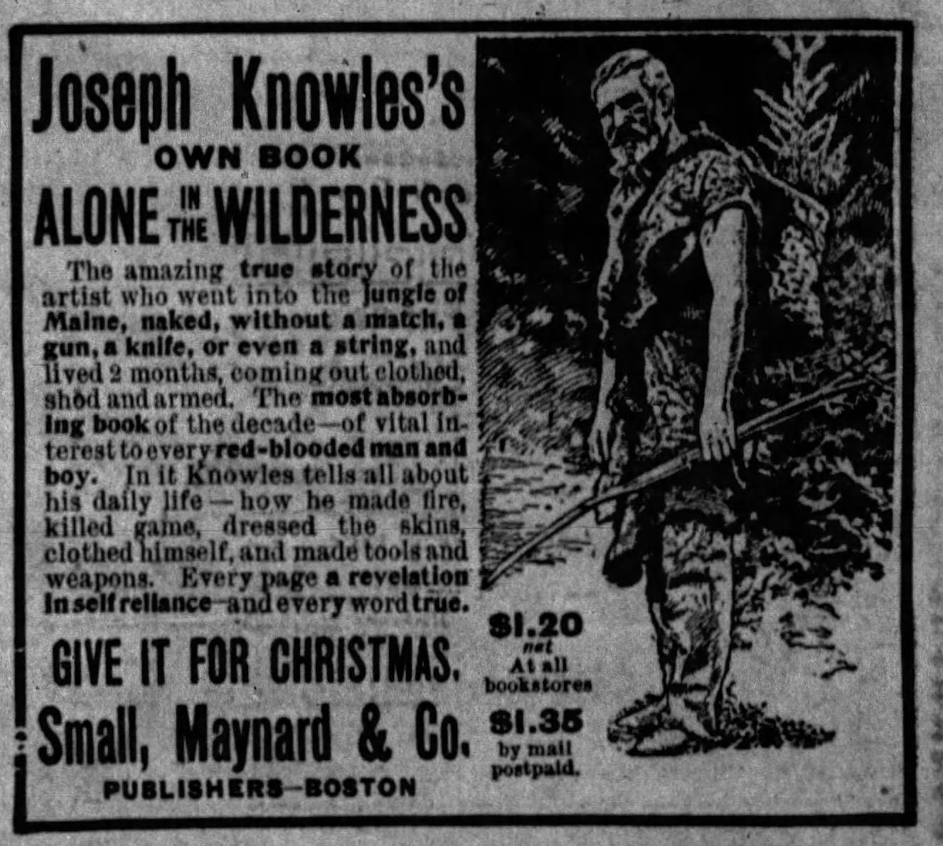 The stories captivated a public already fascinated with characters like Tarzan, adventure novels by Jack London, and rugged figures like Teddy Roosevelt. To them, Knowles was at once a prime example of manliness, conquering the wilderness with only his skills and his wit - and an escapist fantasy of being stripped down to our animal instincts and becoming one with nature. A book, “Alone in the Wilderness,” soon followed, and then a movie of the same name, starring Knowles as himself. It was all quite romantic and exciting - and lucrative for Knowles, who at one point made $1,200 a week in speaking fees.