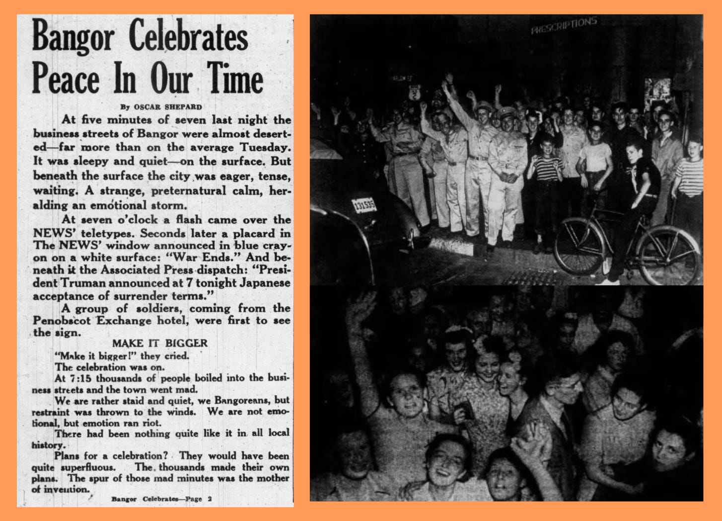 80 YEARS AGO / AUGUST 14, 1945 I think it’s safe to say that most of the people reading this have lived through very few truly life-changing historical events – the kinds of things that bring literally everyone out into the streets in either joy, relief, fear or sadness. Even if the means by which it ended were ultimately destructive, I often think about what it must have been like to witness the end of World War II, 80 years ago this week. I have nothing to personally compare to it.