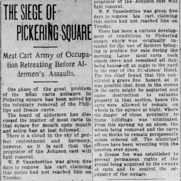 100 YEARS AGO / AUGUST 5, 1925 Try to picture it: instead of a bus station, a parking garage and a never-ending redesign project, Pickering Square is instead the site of a near-daily open-air market, packed with vendors selling everything from jewelry and flowers to whole sides of beef out of their carts. By the 1920s, however, city officials decided such a chaotic mass of humanity and commerce was not befitting of Bangor. They began cracking down on the market, requiring permits for vendors and outlawing shenanigans and fire hazards more broadly. This policy was not received well by the vendors – particularly the meat cart owners, who banded together and refused to move from the square. The Meat Cart Army, as described by the Bangor Daily News, began a kind of Occupy Pickering Square action, resisting the demands for them to move for as long as they could – though in the end, you can’t fight City Hall. Well, you can. But in this case, they couldn’t. The vendors all eventually left. The parking facilities arrived. Could there be open-air markets in Pickering Square again? Maybe. If they ever finish the redesign.